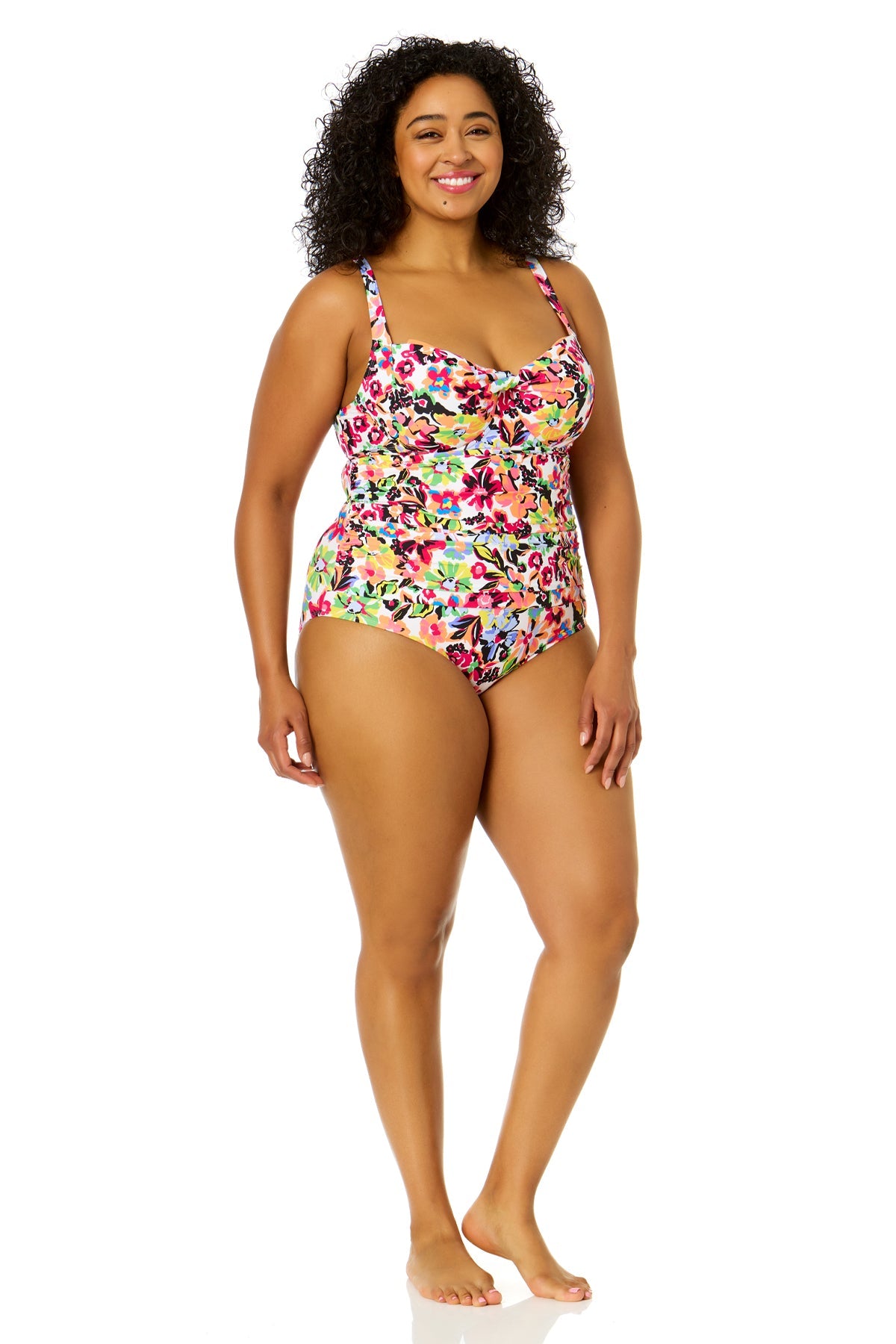 Look extra chic on your next beach trip with our Plus Size Retro Twist Front Shirred One Piece Swimsuit. This plus size vintage-inspired swimsuit has an eye-catching twist detail in the front, while supportive underwire gives you plenty of lift to flatter your figure. This floral swimsuit also has over-the-shoulder adjustable back straps provide extra support while shirring at the torso provides shaping and contour. Pair this Retro Twist Front Swimsuit with any plus size bathing suit cover up for a complete beach look!